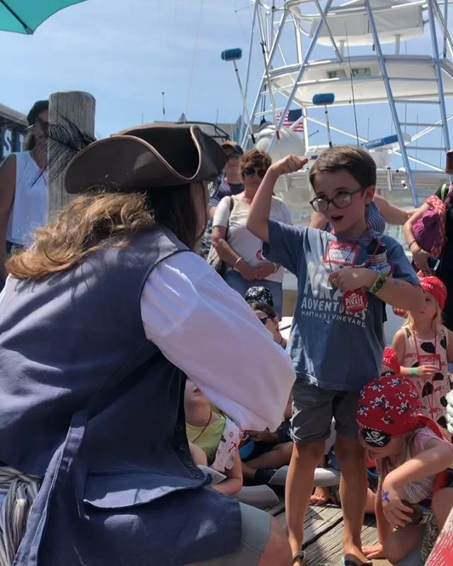 Check in inside the Dockside Marketplace on the Oak Bluffs Harbor—look for the blue and white striped awnings. This is at 12 Circuit Ave Ext, which is a continuation of the main street that passes through OB, but headed toward the Harbor. Inside, you will see the Pirate Adventures Treasure Chest Kiosk. You will then be directed to the outside dress up and staging area where we will meet the crew and prepare to sail. You will be escorted from the dress up area to the boat by the crew.